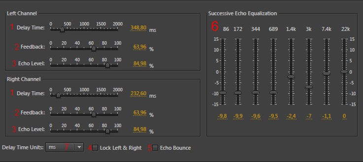 5. Echo Bounce (скачущее эхо) - создаёт эхо скачущее туда и обратно между левым и правым каналами. Если вы хотите создать скачущее туда и обратно эхо, то выберите начальный уровень эхо = 100% для одного канала и 0% для другого. Другие значения для каждого канала будут отражаться в другой канал, создавая два набора эхо в каждом канале.