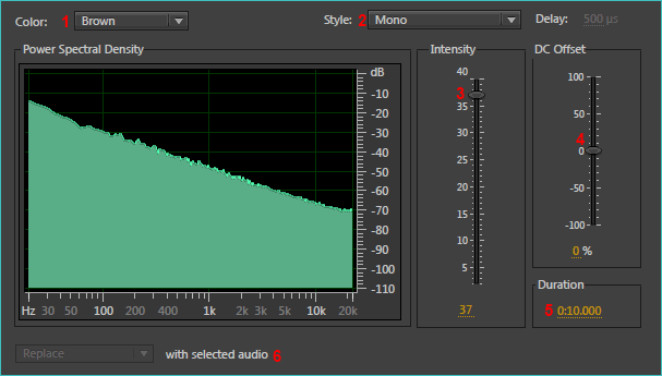 Команда Noise позволяет создавать случайный шум различны цветов. (Традиционно, цвет используется для описания спектрального состава шумов. Каждый цвет имеет свои особенности). Создание шум полезно для создания успокаивающих звуков, таких как водопад (идеально подходит для использования с функцией Binaural Auto-Panner из Adobe Audition) и для создания сигналов которые могут быть использованы, чтобы проверить частотную характеристику динамиков, микрофонов или других компонентов аудио системы.