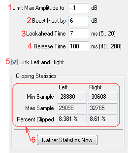 - Gather Statistics Now - обновление статистики, которая показывает, какой процент аудио будет клиппировать, если не будет выполнено ограничение. Щелкните эту кнопку, после изменения любого из входных параметров.