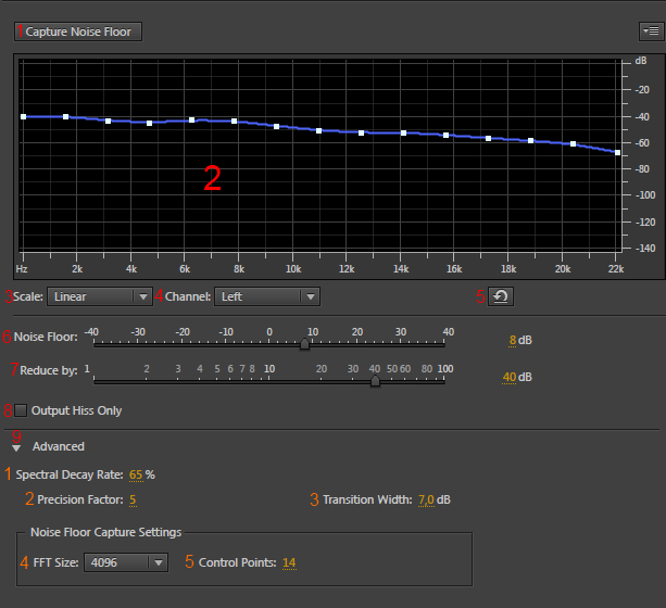 1. Capture Noise Floor (захват уровня шума) - строит график от уровня шума. Построение использует эффект Hiss Reduction, более эффективно удаляющий только шипение, оставляя постоянные звуки нетронутым. Эта опция является наиболее мощным средством подавления шипения.