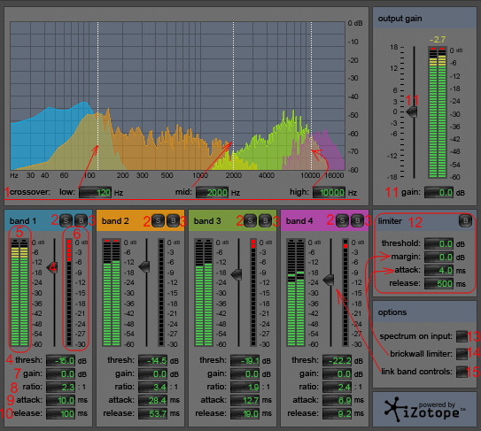 Элементы управления в многополосном компрессоре позволяют точно определить частоты кроссовера, и применять в диапазонах особые параметры сжатия. Нажмите кнопку соло S для прослушки отдельной полосы частот, или кнопку обхода B для отключения обработки выбранной полосы. После точной настройки отдельных полос, выберите Link Band Controls для регулировки их в глобальном масштабе, а затем оптимизируйте общую громкость с помощью ползунка Output Gain и настройте Limiter.