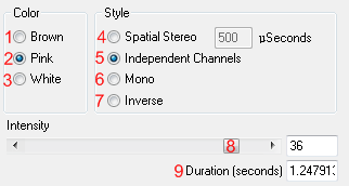 - Spatial Stereo (стерео пространство) - генерирует шум, используя три уникальных источника и пространственно-кодирует их, что создаёт ощущение, что 1 шум приходит с левого канала, 1 из центра, и 1 из правого канала. Когда вы будете слушать результат в стерео наушниках, ваш мозг воспримет этот звук очень объёмным. Чтобы задать расстояние от центра левого и правого источников шума, введите значения задержки в микросекундах. Около 900 до 1000 микросекунд соответствуют максимальной воспринимаемой задержке. Нулевая задержка идентична монофоническому шуму, где левый и правый каналы одинаковы.