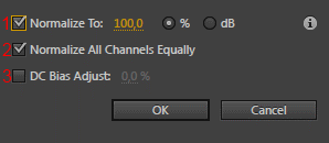 - Normalize All Channels Equally (нормализация всех каналов в равной степени) - использует все каналы стерео или сурраунд сигналов для расчёта количества усиления. Если этот параметр не выбран, количество рассчитывается отдельно для каждого канала, что может усиливать один каналы значительно больше чем другие.