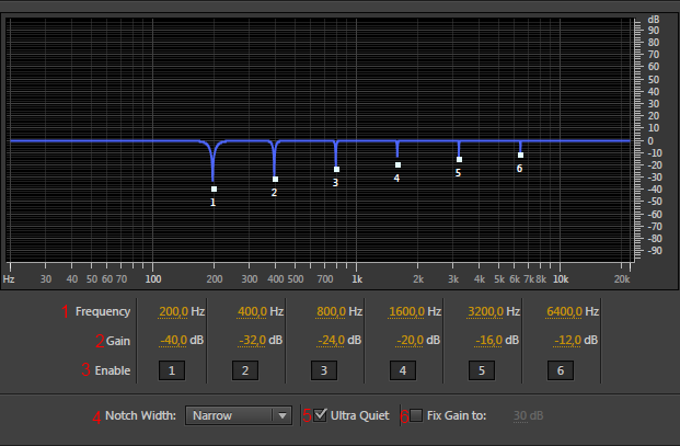 - Notch width (ширина выреза) - определяет диапазон частот для всех вырезов. Три варианта в диапазоне от Narrow (узкого) для фильтров второго порядка, которые удаляют некоторые соседние частоты, до Super Narrow (супер узкого) для фильтров шестого порядка, которые являются очень точными.