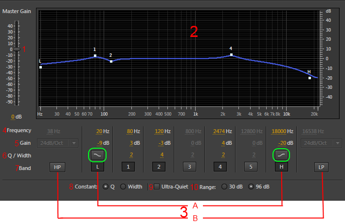 - Band (полоса) - обеспечивает до пяти промежуточных полос, пропускные фильтры высоких и низких частот и полочные фильтры, что даёт очень хороший контроль над кривой эквализации. Выберите полосу для эквализации с помощью параметров описных выше. Полочные фильтры низких и высоких частот обеспечены кнопками наклона (обведены зелёным), которые изменяют крутизну наклона фильтров на 12 дБ на октаву, по умолчанию 6 дБ на октаву.