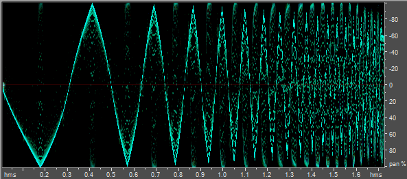 Дисплей Spectral Pan отображает панорамную позицию (в правом и левом канале) каждой частоты в звуковом файле. На оси Х (горизонтальная линейка) отложено время, на оси Y (вертикальная линейка) - измерение панорамной позиции. Верхняя часть дисплея (-100%) соответствует нахождению частоты только в левом канале, нижняя часть дисплея (100%) соответствует нахождению частоты только в правом канале. Чем ярче цвет, тем громче данная частота.