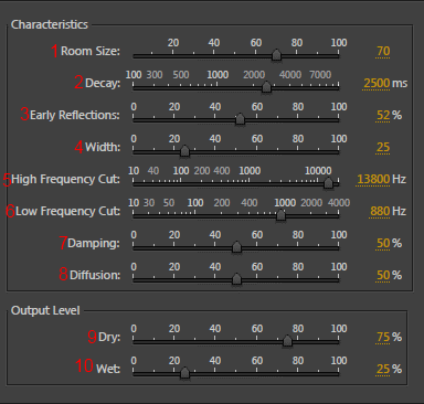 - Early Reflections (ранние отражения) - управление процентом эхо, которые в первую очередь достигнут уха, создавая чувство общего размера комнаты. Слишком большое значение может привести к искусственным звукам, в то время как слишком низкое значение может удалить звуковые сигналы для определения размера комнаты. Значение 50% является хорошей отправной точкой.