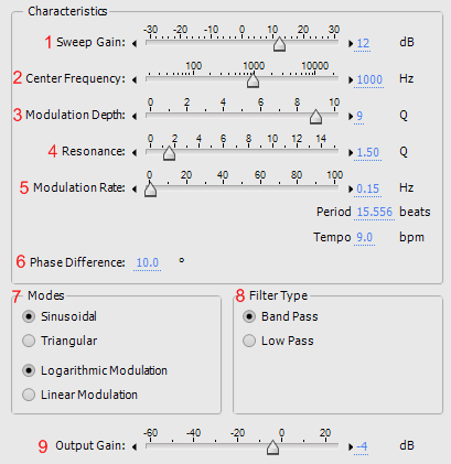 - Modulation Rate (частота модуляции) - указывает скорость, с которой фильтр движется вокруг центральной частоты, охватывая динамический диапазон заданный параметром Modulation Depth (3). Значения: Hz (герц), Period (миллисекунды за удар) и Tempo (удары в минуту). Для того чтобы изменения происходили в такт песне, введите темп композиции в поле Tempo. Например, введите 240 для композиции с темпом 120, это создаст движение восьмыми.