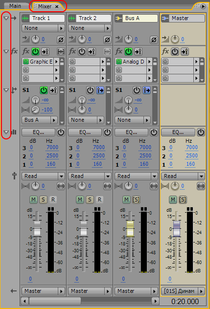 Малая красная область переход между режимами. Большая красная область, свернуть/развернуть элементы микшера.