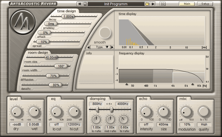 • Редактирование: при изменении любого параметра что-либо реально меняется. Элементы управления, не меняющие чего-либо ощутимого - бесполезны в реверберации. Элементы управления ArtsAcoustic Reverb работают именно так, как вы ожидаете.