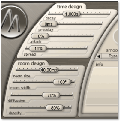 Прямо рядом с логотипом вы найдете регуляторы Time Design, задающие параметры времени реверберации. Ниже расположены фейдеры Room Design, которые регулируют характеристики помещения.