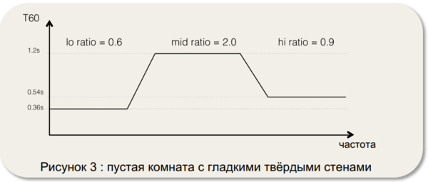 Если непонятно, давайте приведем пример: вы хотите смоделировать пустую заглушенную комнату, с затуханием в 1секунду. Вы вешаете в этой комнате такое количество штор, при котором высокие частоты в хвосте реверберации затухают в два раза быстрей остальных частот. В два раза быстрее означает половину времени, то есть 0,5. Итак, вы установили отношение HiRatio 0.5 и высокие частоты затухают в 0.5 времени от времени затухания общей реверберации (Decay).
