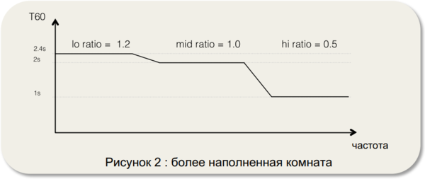 Теперь давайте смоделируем комнату с большей наполненностью и теплом. Для этого, вы должны настроить время затухания низких частот намного больше времени затухания остальных частот. Низкие частоты должны затухать в 1.2 раз дольше, поэтому надо установить Lo Ratio равным 1.2. Если общее время реверберации установлено в 2 секунды, то низкие частоты исчезнут через 2.4 секунды. Для высоких частот выбираем значение как в примере 1.