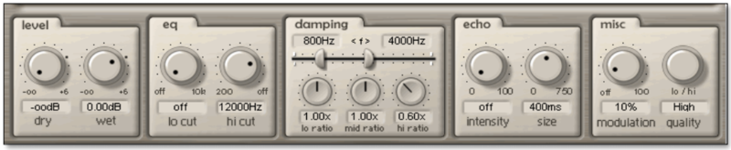 Две ручки Dry и Wet регулируют уровнями необработанного входного сигнала и сигналом реверберации. Измеряется в dB, в диапазоне от -∞ dB (нет сигнала) до +6 dB (усиление на 6 dB). В настройках по умолчанию и во всех заводских пресетах, Dry установлен в положение -∞ dB, а Wet - 0 dB.