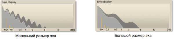 Часто ошибочно предполагается, что существует связь между размером комнаты и временем реверберации. Но давайте сравним подвальный гараж и кинозал. Оба помещения могут иметь одинаковый размер, но время реверберации будет сильно отличаться. Восприятие размера комнаты сильно зависит от времени отражений. Если они прибудут очень скоро и с большой частотой, наш мозг предположит небольшую комнату. Если есть сильные отражения, которые прибывают позже, будет ощущение большой комнаты. Помимо отражений, тембр реверберации также играет важную роль: маленькая комната звучит как бы перед носом и плотно, большая звучит открыто и широко. Также на ощущение размера влияет нарастание реверберации. Чем меньше комната, тем быстрей нарастает реверберация. Параметром Room Size (размер комнаты) вы можете настроить виртуальный размер помещения. Измерение ведётся в метрах по диагонали. В окне Time Display вы можете увидеть изменения первых отражений, при настройке Room Size. Обратите внимание на то, как нарастает реверберация и меняется её тембр!