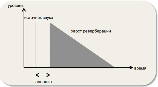 На этой диаграмме можно увидеть три важных области. Сначала идёт основной звуковой сигнал, затем следуют первые отражения, и далее идёт затухание реверберации. В разных вариациях, такое происходит во всех видах помещений.