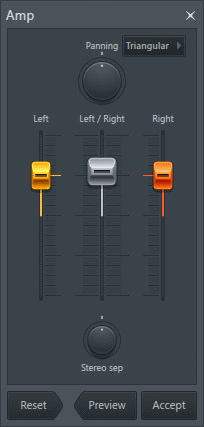 Инструмент Amp работает аналогичным образом как параметры микшера, и включает параметры разделения стереобазы, связанного панорамирования и независимые уровни для левого и правого каналов.