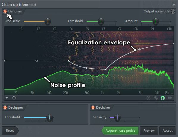 - Output noise only (выход только шум) - если включено, то часть сэмпла которая удаляется с помощью инструмента Denoiser (шум) была слышна. Включите эту кнопку, когда вам нужно тонко настроить параметры Threshold и Amount процесса Denoiser (с помощью функции предварительного прослушивания). Прислушайтесь к настройкам, которые звучат только с шумом, который должен быть удалён. Если в выходе шума вы слышите части звука, которые хотите сохранить, то настройки слишком агрессивные. Если эту кнопку отключить, то кнопки Preview и Accept будут обрабатывать звук в соответствии с настройками плагина.