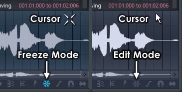 • Заморозка - предотвращает изменения сэмпла. Примечание: Курсор в режиме замораживания имеет вид Х. Обратите внимание на то, как изменяется курсор в зависимости от того в каком режиме вы находитесь заморозка или редактирование. В режиме заморозик, вы не сможете вносить изменения, а сможете только наводить для чтения амплитуды сэмпла и значений позиции. Численное значение отображается в окне подсказок.