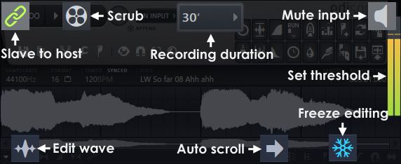• Scrub (перемотка) - щёлкните левой кнопкой мыши и удерживайте кнопку мыши, двигайте влево или вправо, чтобы сэмпл воспроизводился под контролем мыши.