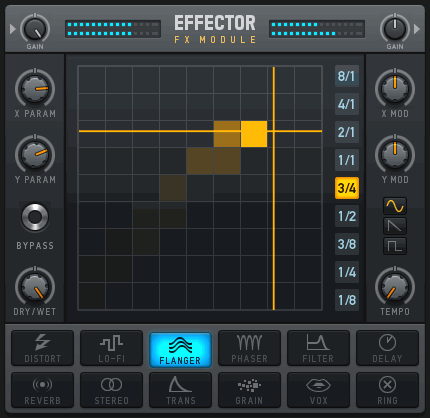 Effector предоставляет 12 эффектов ориентированных на выступления, которые можно использовать по одному. Крупный центральный X/Y пэд (ручки X/Y Parm) может быть привязан к контроллеру для выразительного управления или управляться с помощью сенсорного интерфейса.