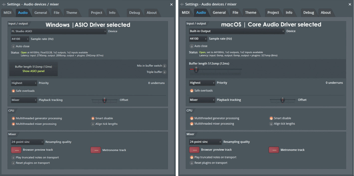 1. Windows - Нажмите кнопку Show ASIO panel, чтобы открыть настройки Buffer Size (размер буфера) (задержка) драйвера аудиоустройства. Вы должны увидеть панель управления FL Studio ASIO: