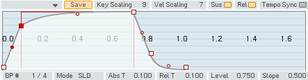 Некоторые параметры, такие как огибающие, отображаются графически в виде кривых и линий с точками.