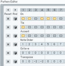 Редактор узора это место, где вы развиваете свою последовательность. Он состоит из сетки со столбцами, представляющих собой отдельные шаги и из шести строк представляющих собой шесть параметров. Шаги и двоичные параметры можно активировать/отключать одним нажатием кнопки мыши. Параметры предлагающее более одного значения предоставляют меню с возможными значениями.