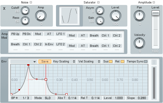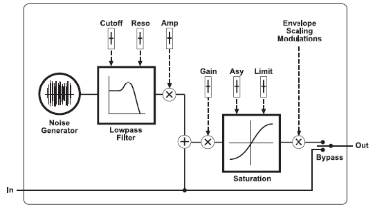 Это оператор для специальных случаев, он во многих отношениях напоминает обычный оператор: его амплитуда может быть управляема огибающей, масштабирование клавиш, амплитудная модуляция, и имеется обратная подача на другие операторы. Однако есть возможность создания шума и обработки входящего сигнала вэйвшейпером (искажения). Шум смешивается с входящим сигналом, обрабатывается стадией сатурации и перемножается огибающей.