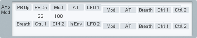 Это подcтраница матрицы модуляции. Пожалуйста, обратитесь к соответствующей статье для получения дополнительной информации о назначении контроллеров, разница только в том, что в целях экономии места, источники модуляции высоты тона расположены в два ряда друг над другом, вместо одной длинной линии.