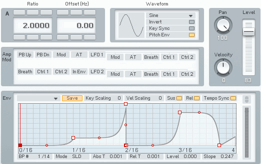 Ratio (соотношение частоты) определяет математическую зависимость частоты оператора по отношению к основной частоте ноты, которая играется. 1.0000 означает, что оператор имеет туже фундаментальную высоту тона, 2.0000 устанавливает оператора на вторую гармонику (на 1 октаву выше), 3.0000 является третьей гармоникой (октава + пять) и т.д. 0.5000 является субгармоникой на октаву ниже фундаментальной.