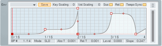 Значение выравнивания точек зависит от текущего масштабирования, для масштабирования щёлкните правой кнопкой мыши по шкале огибающей и перетащите. (При включенном Tempo Sync, маркировка шкалы будет откалибрована в ритмических значениях вместо секунд). Если поступит информация о изменении темпа, времена огибающей пересчитываются в соответствии с текущим темпом песни. Пример: Если зацикливаемость огибающей установлена продолжительностью в 1/4, она останется длительностью в 1/4 пока не изменится темп.