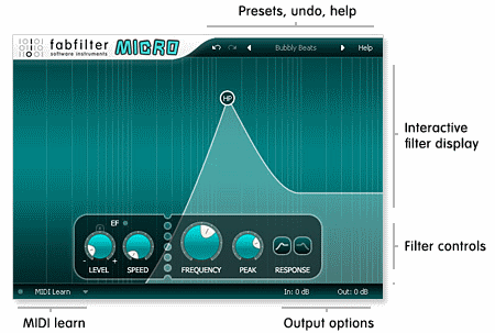 Интерфейс FabFilter Micro в основном состоит из большого дисплея фильтрации, который позволяет интерактивно настроить фильтр.