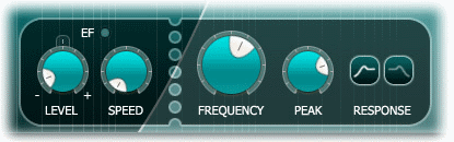 - EF Speed (скорость огибающей следования) - настраивает как быстро огибающая реагирует на изменения входящего сигнала. Когда повёрнуто до упора влево, огибающая реагирует на изменения быстро и агрессивно. Когда повёрнуто до упора вправо, то реакция на изменение происходит очень медленно и гладко. Положение по умолчанию (по центру) обеспечивает хорошее общее поведение.