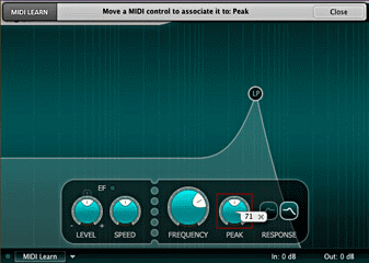 Нажмите кнопку MIDI Learn в нижней панели, чтобы войти в режим MIDI обучения. Интерфейс тускнеет и параметры, которыми можно управлять выделяются. Каждый параметр имеет небольшое текстовое облако, которое будет отображать соответствующий номер контроллера. Теперь, чтобы связать номер контроллера с параметром выполните следующие действия: