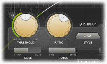 - Threshold (порог) - определяет уровень в боковой цепи выше которого должно происходить подавление. Круговой измеритель уровня боковой цепи вокруг ручки Threshold показывает уровень фильтрованного сигнала, и по возможности стерео-связь, в общем тот сигнал который используется для детектора. Эта обратная связь значительно облегчает выбор правильного значения порога.
