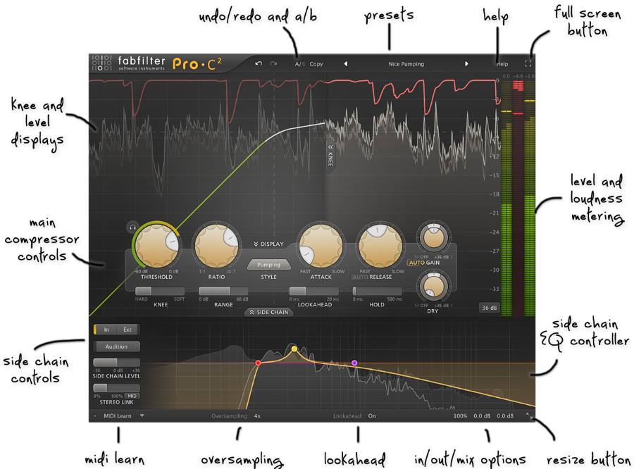 Интерфейс FabFilter Pro-C 2 разработан для того чтобы быть простым в использовании, обеспечивая при этом всю необходимую информацию и средства управления. Он состоит из следующих элементов: