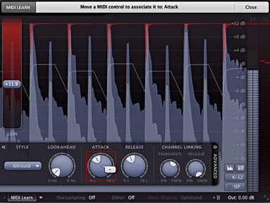 Управлять параметрами FabFilter Pro-L непосредственно с помощью MIDI очень легко используя функцию MIDI обучения. С помощью MIDI обучения, вы можете связать любой MIDI-контроллер с любым параметром.