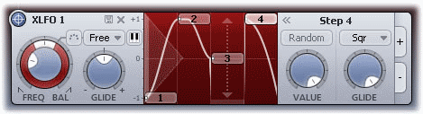 - Glide (скольжение) - глобальная ручка Glide действует как общее смещение скольжения. Количество скольжения определяет точку в пределах шага к которой XLFO начинает интерполировать к значению следующего шага. Глобальное значение Glide добавляется к значению скольжения отдельных шагов, чтобы прийти к конечному значению скольжения каждого шага. Индивидуальное значение скольжения шага ограничено между 0 (без интерполяции) и 1 (полная интерполяция). Поскольку глобальное значение Glide может находиться в диапазоне от -1 до 1 оно может полностью отменить отдельные значения скольжения шагов при экстремальных настройках. Кроме того это цель для модуляции, что позволяет получать очень интересные эффекты.
