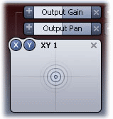 Поскольку XY контроллер имеет два "выхода", он также имеет две кнопки перетаскивания источника X и Y. Слоты для XY контроллера сгруппированы в два ряда, Х это верхний слот. Например, на скриншоте выше, Х управляет панорамированием, а Y уровнем.