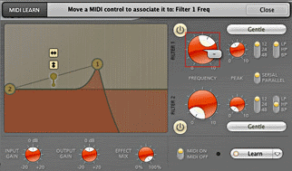 Нажмите кнопку MIDI Learn в нижней панели, чтобы войти в режим MIDI обучения. Интерфейс тускнеет и параметры, которыми можно управлять выделяются. Каждый параметр имеет небольшое текстовое облако, которое будет отображать соответствующий номер контроллера. Теперь, чтобы связать номер контроллера с параметром выполните следующие действия: