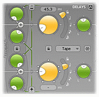 - Tape (лента) - ведёт себя как классический дилэй основанный на магнитной ленте. Когда время задержки изменяется в положительном направлении, т.е. время задержки становится короче, вы услышите увеличение высоты тона задержанного сигнала. И наоборот, если время задержки становится дольше вы будете слышать уменьшение высоты тона задержанного сигнала. Это путь аналоговой задержки звука, создающий весёлое 'воспроизведение' задержки.