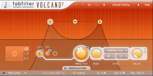 Конечно, новая версия Volcano добавляет много новых возможностей. Начнём с того, что теперь вы получаете четыре полнофункциональных фильтра, которые могут быть маршрутизированы практически любым возможным способом (в том числе поканально и мид/сайд). Затем начинается самое интересное с нашей полностью заново разработанной системой модуляции с 24 слотами матрицы модуляции. И вместо двух простых LFO и одного генератора огибающей в Volcano 1, теперь вы получите всё что вам нужно XY Controller, XLFO, генератор огибающей, следование за огибающей и MIDI источники! Конечно, новая версия также имеет вход боковой цепи, которая может быть использована для запуска генераторов огибающей или получения сигнала для следование за огибающей. Volcano 2 также отличается нашей улучшенной системой MIDI обучения, которая позволяет легко связать ваши контроллеры с параметрам Volcano.