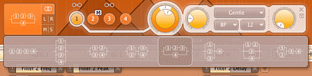 • L/R - в этом случае левый и правый каналы будут проходить через различные фильтры. Это даёт более экстремальные условия и стерео эффекты. Если имеется два фильтра, левый канал будет идти только через фильтр 1, а правый только 2. Если имеются четыре фильтра, фильтр 1 и 2 используются левым каналом, а 3 и 4 правым.