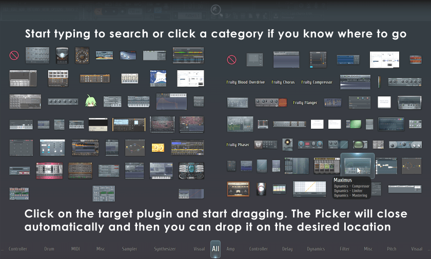 Сборник плагинов (F8) отображает базу данных плагинов в виде массива (генераторы слева, эффекты справа, как показано ниже). Чтобы использовать сборник плагинов, нажмите, удерживайте и перетащите значок плагина который вы хотите использовать. Интерфейс сборника закроется, оставив удерживаемый вами плагин готовым для перетаскивания на нужное место внутри FL Studio. Альтернативно вы можете произвести по плагину двойной щелчёк, это загрузит его, или двойной щелчок по эффекту загрузить его в выбранный канал микшера.