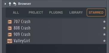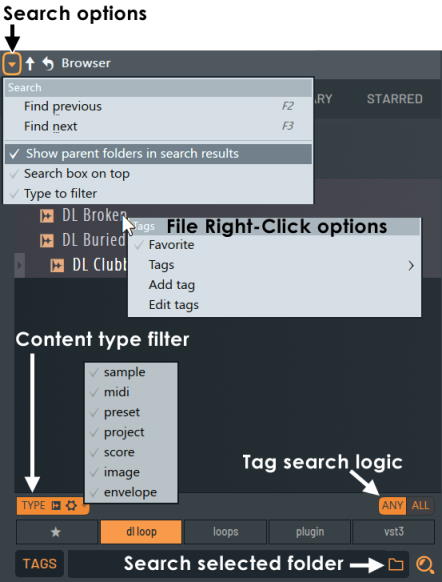 • Поиск в браузере (Ctrl/Cmd+F) — позволяет использовать расширенные функции поиска. Спецсимволы: 'sytr*' найдёт 'sytrus', 's*us' найдёт 'sytrus' или 'stylus', и логический поиск (AND, OR, NOT) также работает. Советы: Не забудьте использовать фильтр содержимого Type, чтобы найти, например, только сэмплы (звук) или проекты.