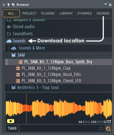 Загруженные звуки сохраняются в папке пользовательских данных в ...Документы\Image-Line\Downloads\FL Cloud Sounds. Эта папка доступна непосредственно из главного браузера FL Studio в разделе «Sounds». Загрузки также регистрируются в вашей учетной записи FL Studio для последующего использования.