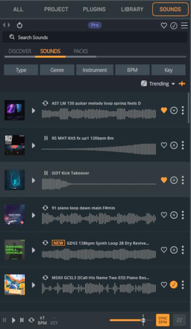 • Избранное (значок сердца) - нажмите на значок сердца, чтобы добавить в список «Избранное». Используйте этот список в качестве «списка желаний» для еще не загруженных звуков. Это относится только к содержимому вкладки «Sounds», которое вы ещё не загрузили. Вкладка Избранное (Starred) в браузере относится только к загруженному контенту. Чтобы содержимое появилось в Избранном после загрузки из браузера, его нужно будет добавить в Избранное.
