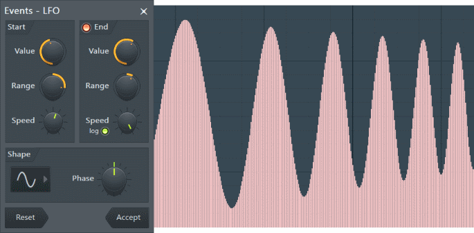 Инструмент LFO позволяет рисовать формы LFO в редакторе событий или внизу пианоролла.