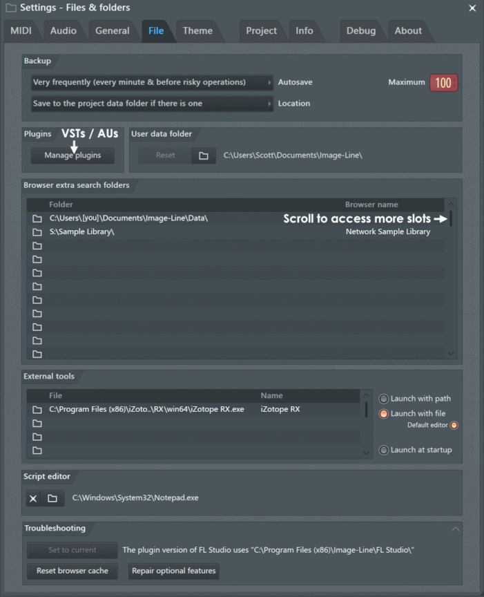 Чтобы открыть файловые настройки, из главного меню выберите команду 'Options > File settings' или нажмите клавишу F10 на клавиатуре. Страница файловых настроек позволяет сделать в браузере ссылки на дополнительные каталоги, а также указать место где хранятся ваши VST/AU плагины. После этого можно получить доступ к этим файлам непосредственно из браузера FL Studio. Чтобы открыть: нажмите F10 и выберите закладку File. При первом открытии этой страницы, слоты папок будут пустыми, каждая строка представляет собой одну папку которую вы можете добавить в браузер. Каталоги установленные здесь также будут использоваться для поиска (и все вложенные папки) сэмплов и звуков при загрузке проекта. Неправильно выбирать здесь корень вашего жёсткого диска, так как FL Studio будет искать во всех папках на вашем диске, когда ищет потерянный файл.